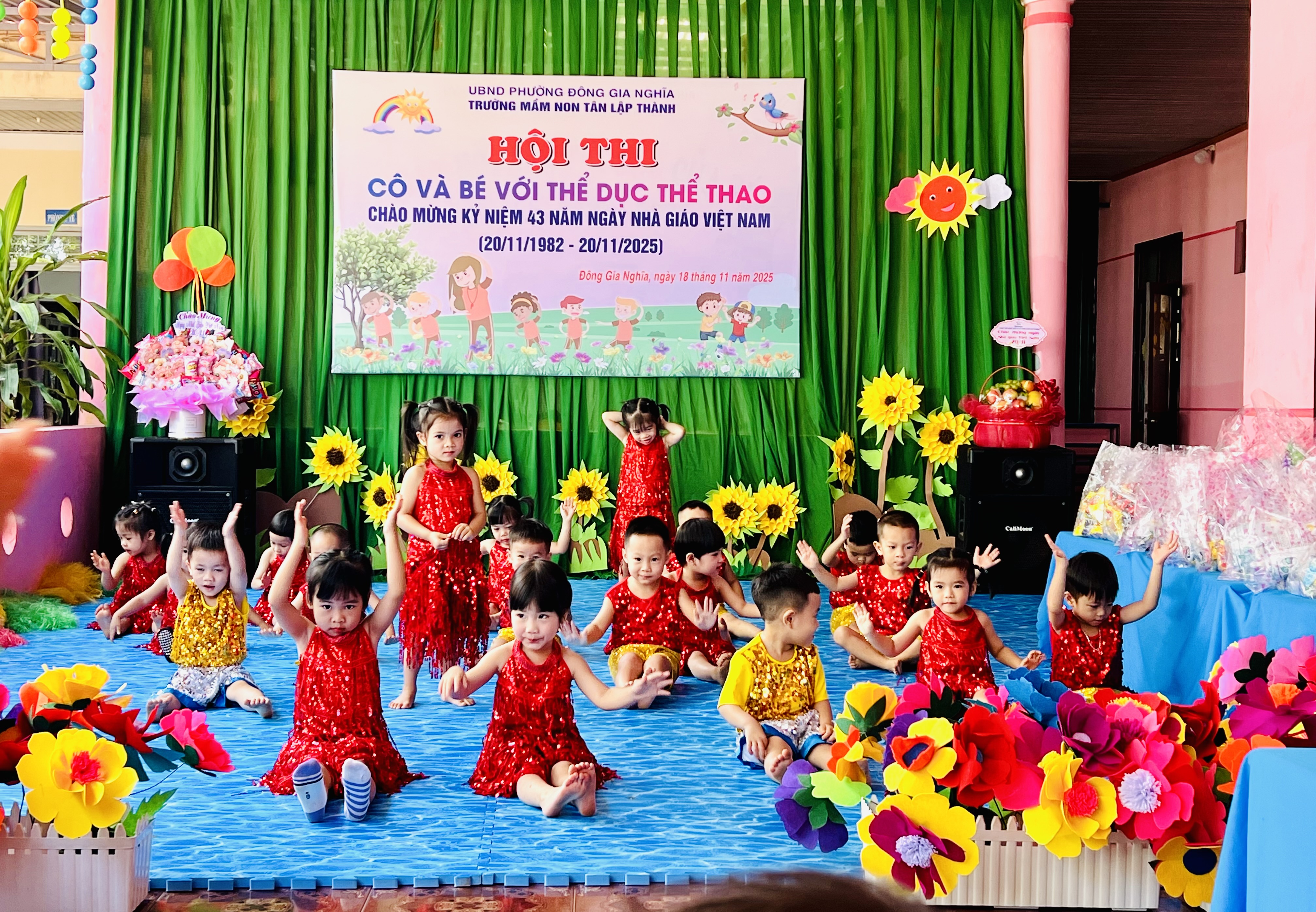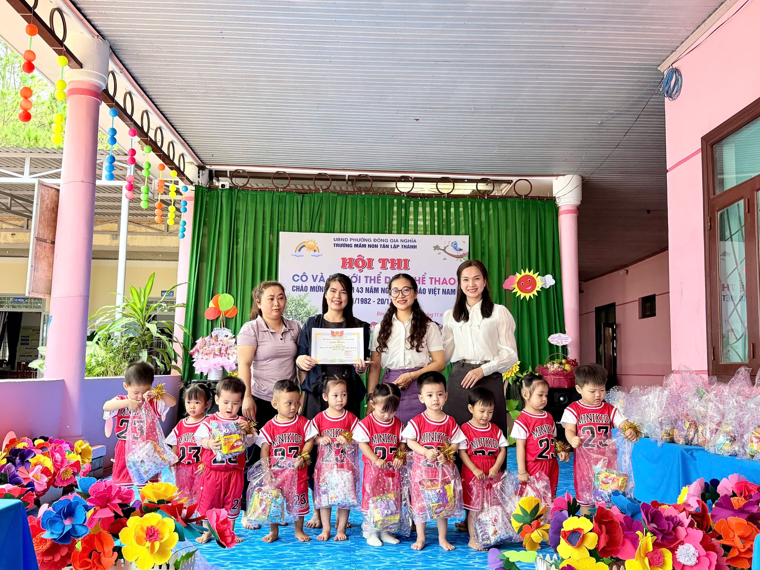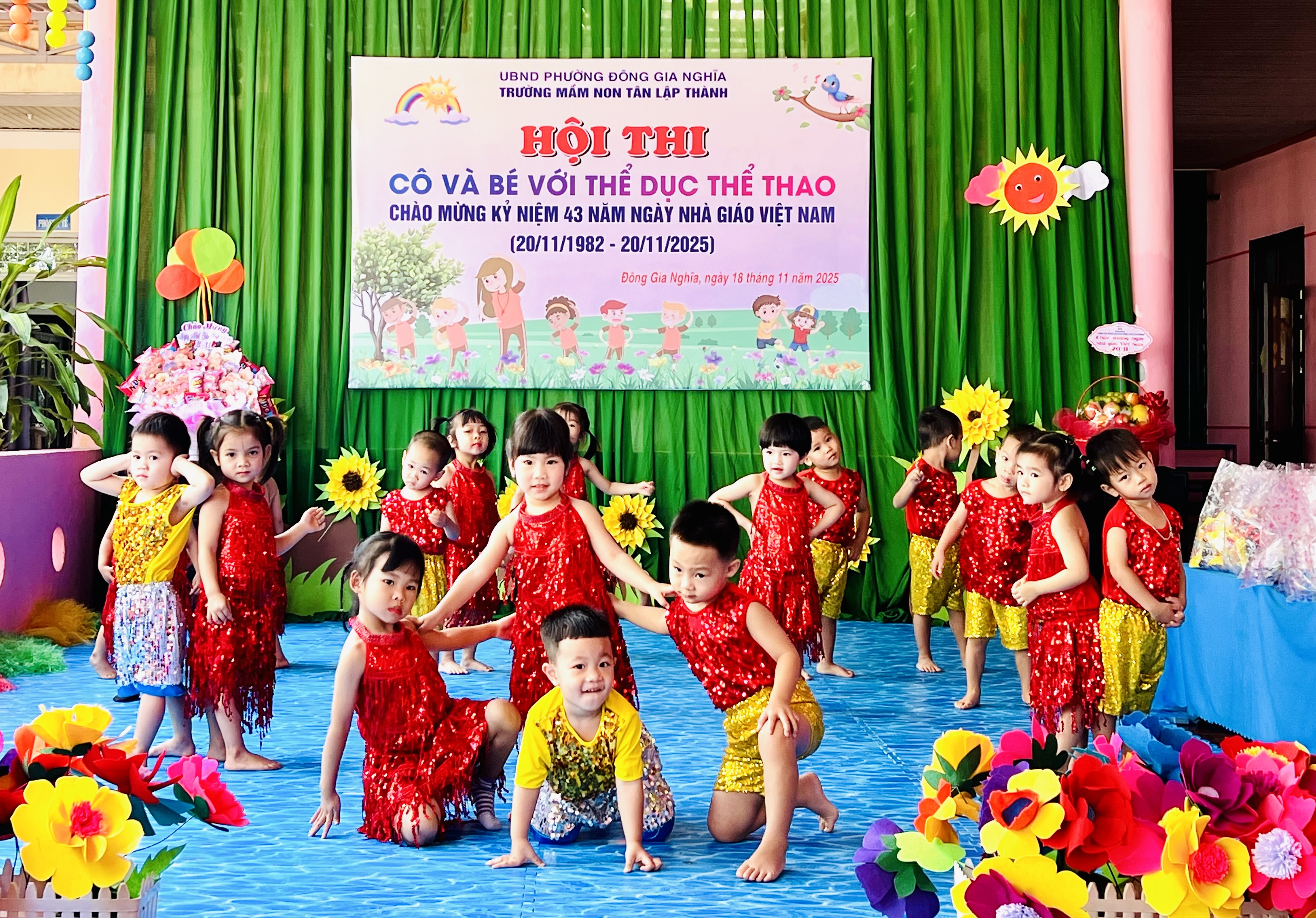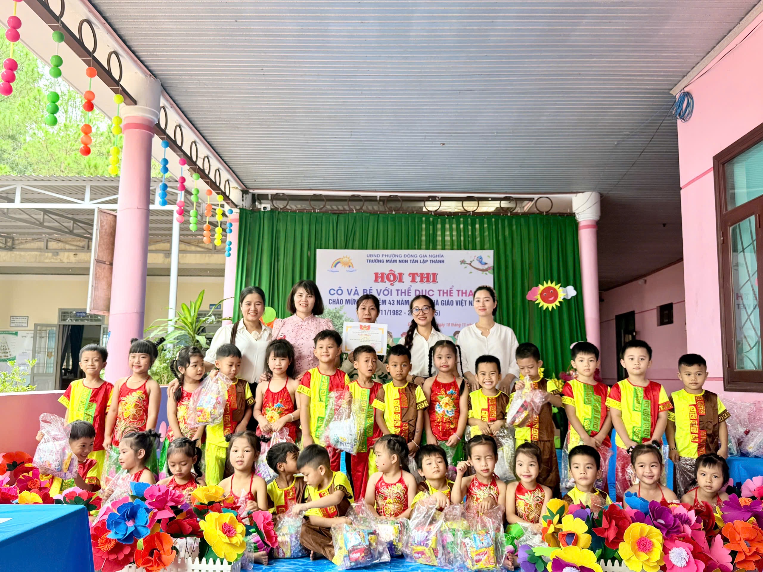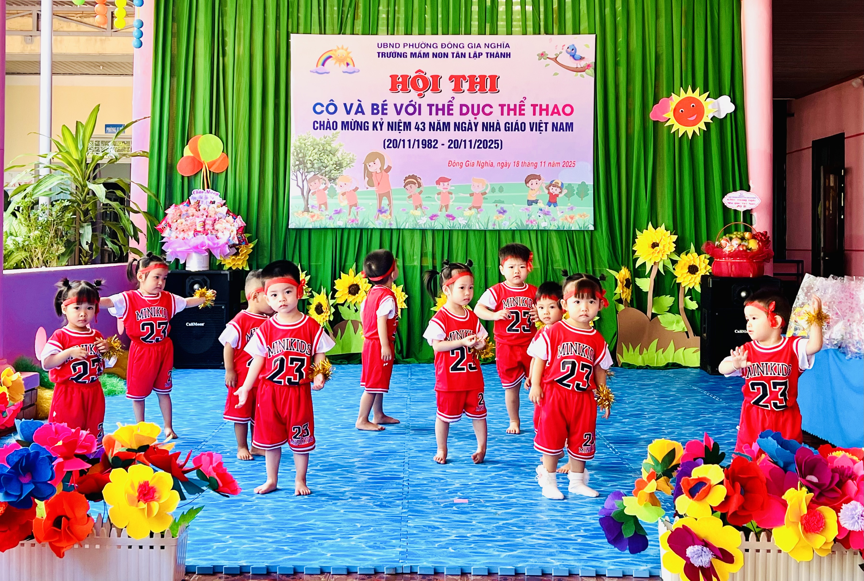 Để chào mừng kỉ niệm 43 năm ngày Nhà giáo Việt Nam. Ngày 18//11/2025 trường MN Tân Lập Thành phối hợp cùng Ban đại diện CMHS toàn trường tổ chức hội thi “Cô và Bé với thể dục thể thao” cấp trường năm học 2025-2026. Với sự tập luyện không ngừng nghỉ, cuộc thi đã thành công tốt đẹp với các giải thưởng như sau: Lớp Lá đạt giải nhất; Lớp Chồi đạt giải nhì; Lớp Mầm đạt giải Ba; và cuối cùng lớp nhà trẻ đạt giải Khuyến khích.