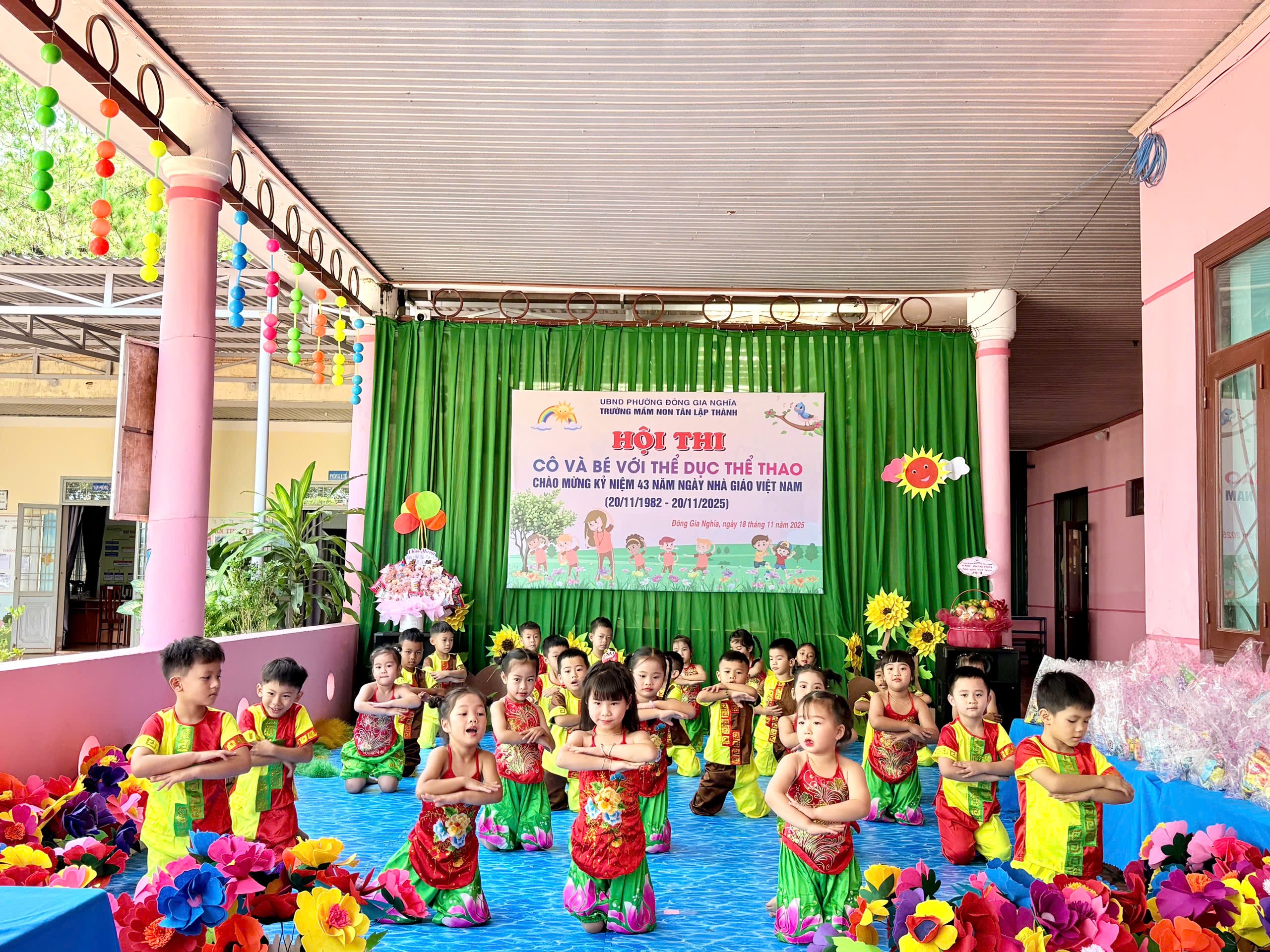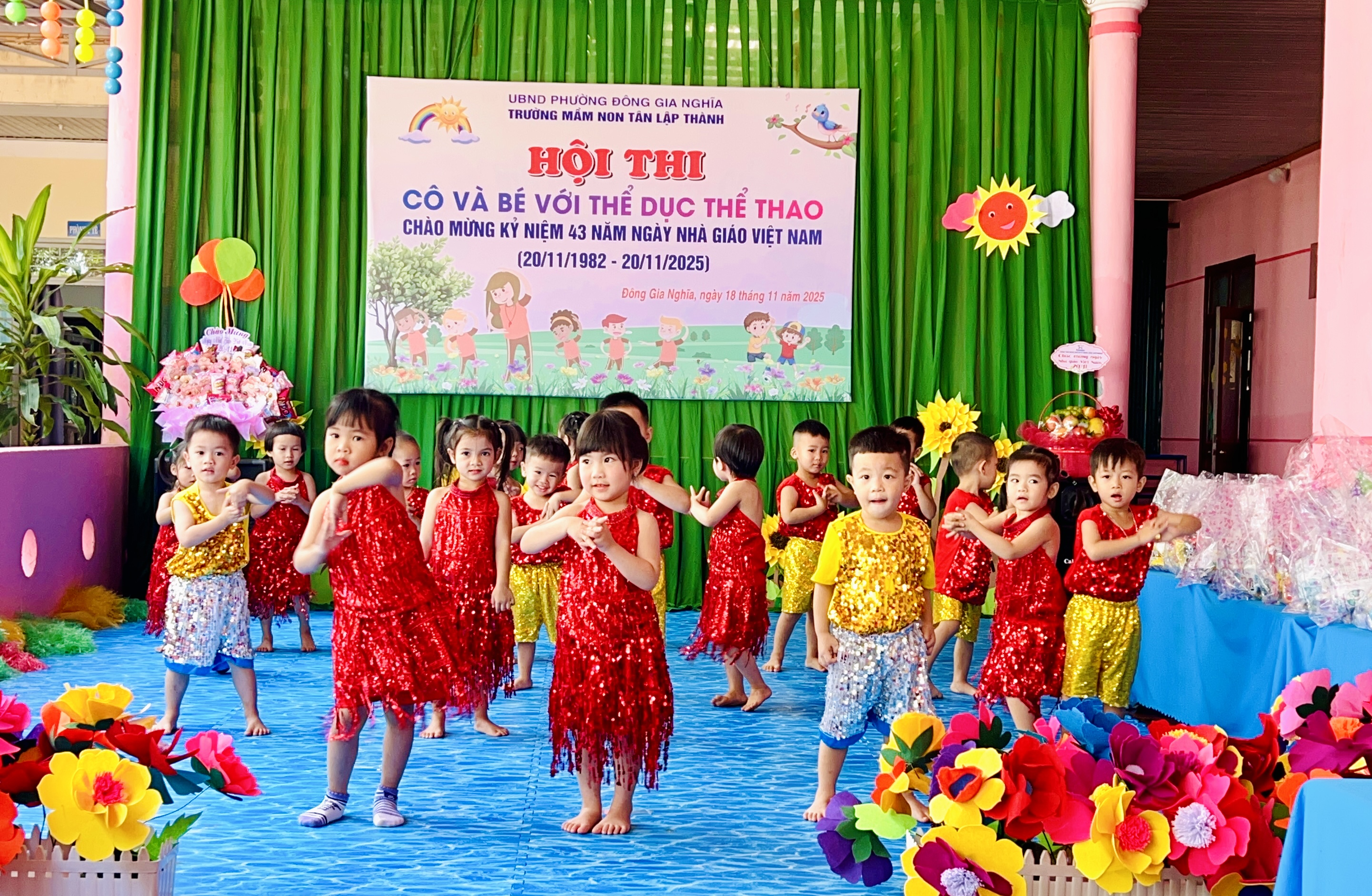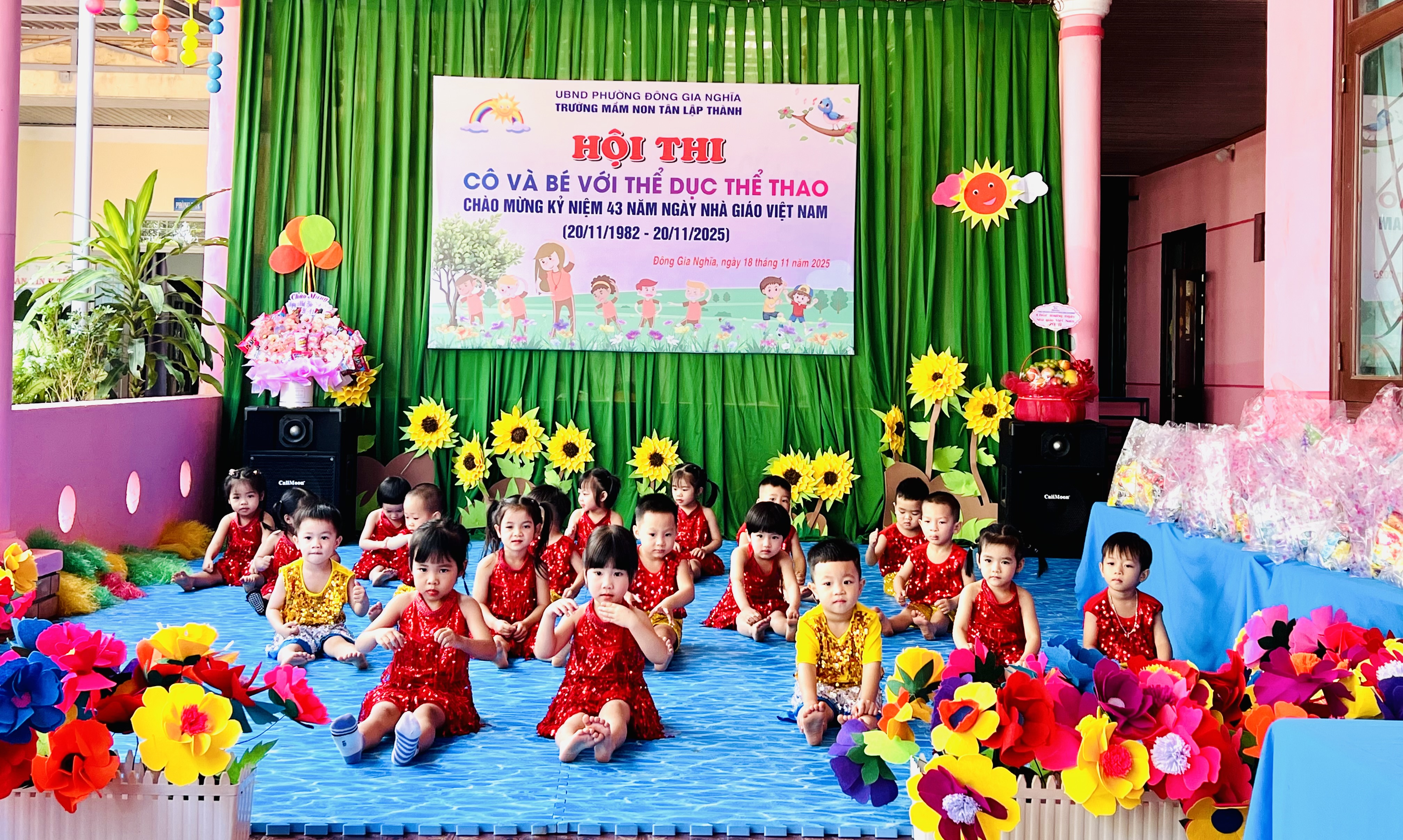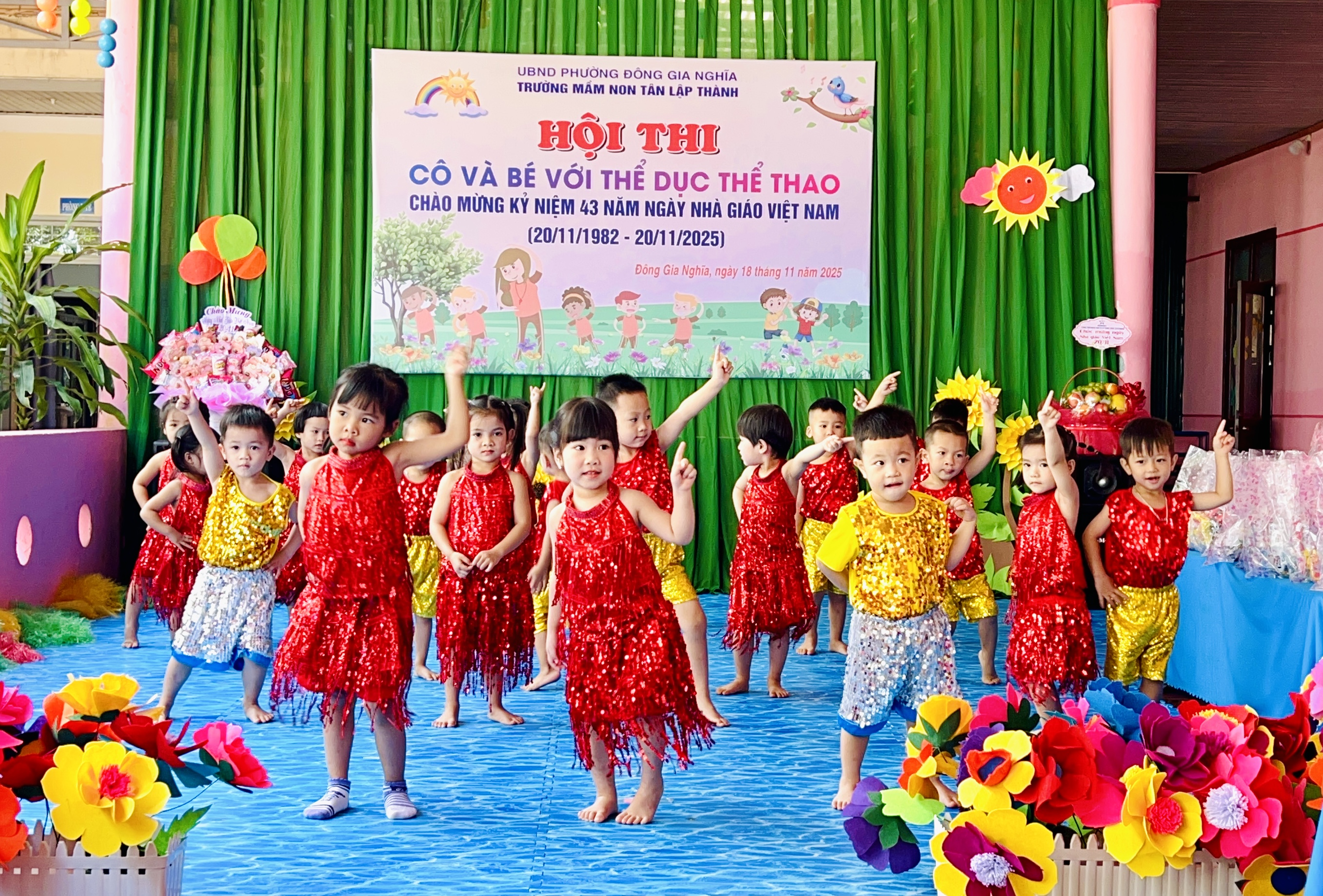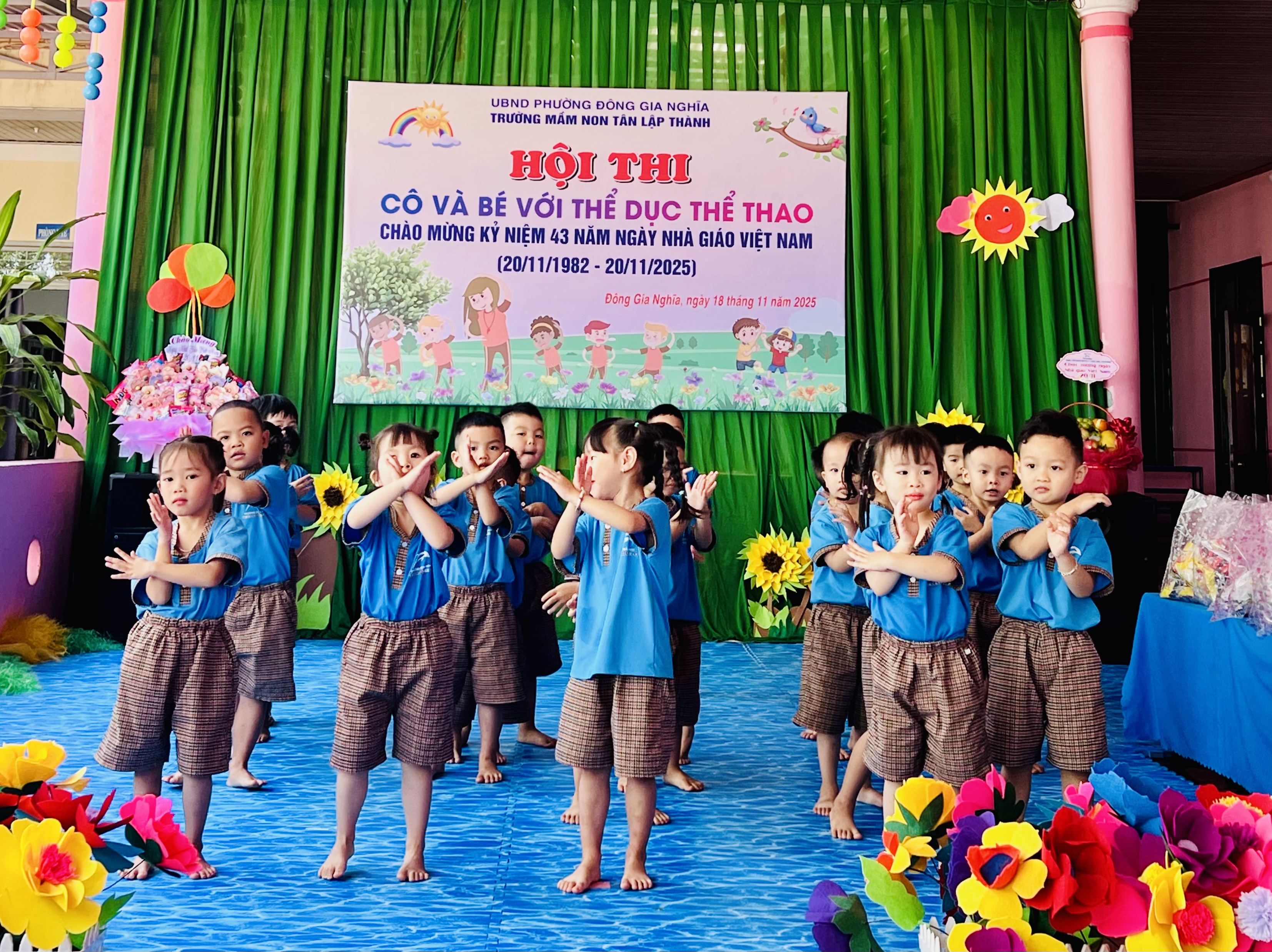 Để chào mừng kỉ niệm 43 năm ngày Nhà giáo Việt Nam. Ngày 18//11/2025 trường MN Tân Lập Thành phối hợp cùng Ban đại diện CMHS toàn trường tổ chức hội thi “Cô và Bé với thể dục thể thao” cấp trường năm học 2025-2026. Với sự tập luyện không ngừng nghỉ, cuộc thi đã thành công tốt đẹp với các giải thưởng như sau: Lớp Lá đạt giải nhất; Lớp Chồi đạt giải nhì; Lớp Mầm đạt giải Ba; và cuối cùng lớp nhà trẻ đạt giải Khuyến khích.